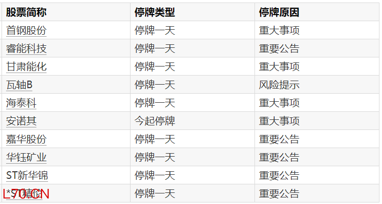 A股停牌提示:10股今日停牌