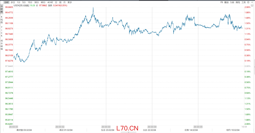 外汇方面,本周美元指数受益于地缘冲突、经济数据反弹(不含非农)和滞胀交易。DXY周线上涨超过1.3%,为2024年11月以来最佳单周表现,盘中多次突破99关口,自高触及99.69。