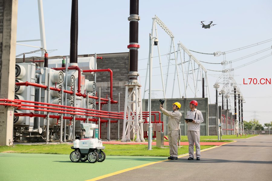 国网上海超高压公司运维人员在1000千伏练塘变电站应用无人机和智能巡检机器人巡视主变压器