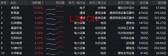 成份股方面,光模块龙头新易盛涨超8%,创历史新高,中际旭创涨逾6%;光伏龙头晶盛机电、晶科能源涨逾5%,阳光电源涨超4%。