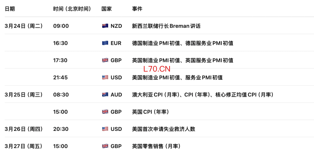 3月23日周一,欧元区与美国在基本面上暂无重要数据和事件公布。