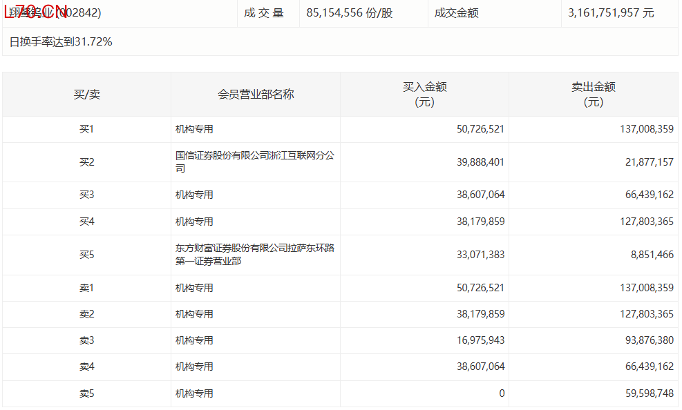 翔鹭钨业今日涨4.60%,有5家机构专用席位净卖出3.40亿元