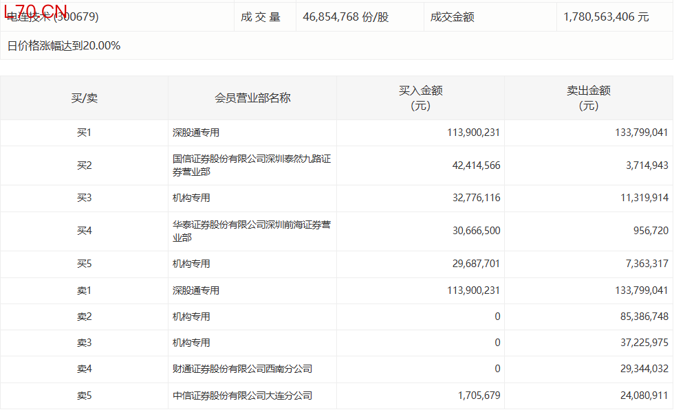 电连技术今日20cm涨停,有2家机构专用席位净卖出1.23亿元