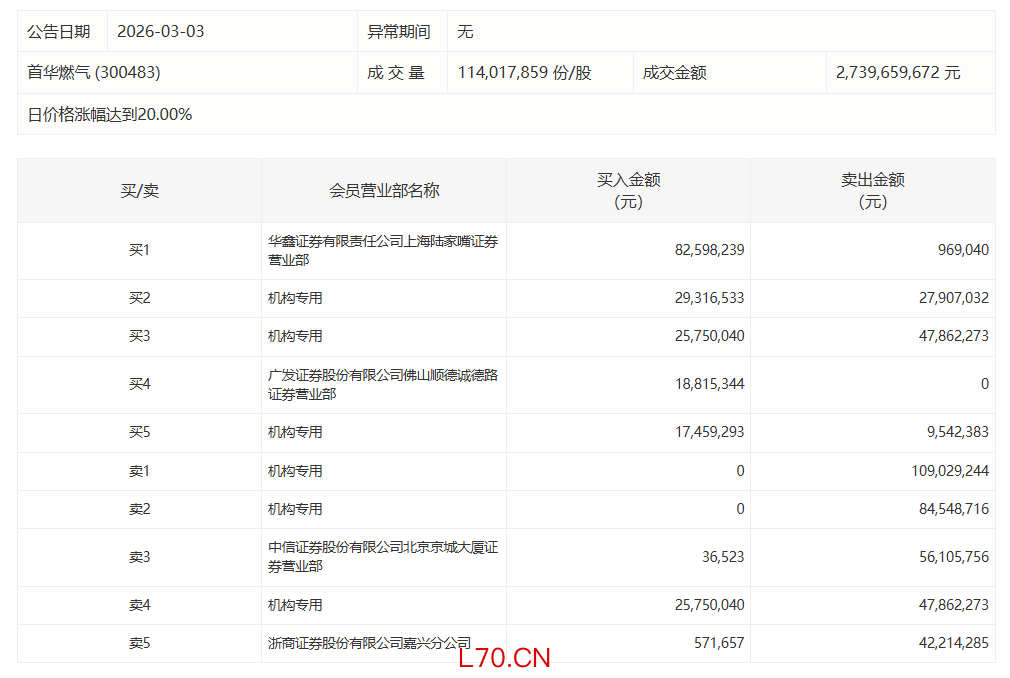 首华燃气今日20%涨停,有3家机构专用席位净卖出2.16亿元